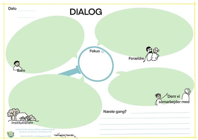 Brug skabelonen til samtaler med forældrene. Det kan være i forbindelse med opstart, overgang eller bekymring. Skabelonens bobler sikrer at alles perspektiver bliver hørt og inddraget. Noter evt stikordsnoter ned i bobler og afslutningsvis hvilke aftaler i laver (Næste gang). Så fungerer skabelonen også som det fælles referat.