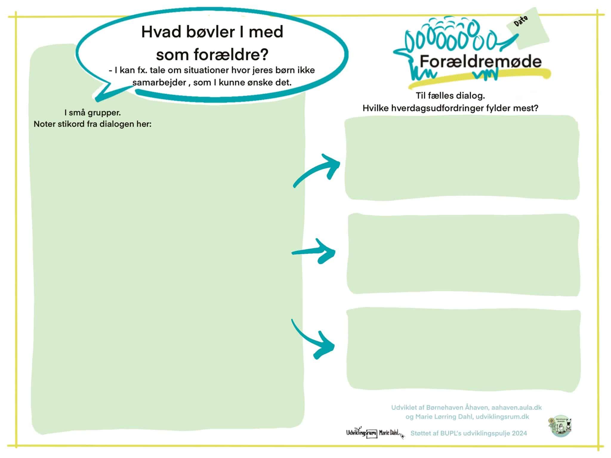 Brug skabelonen på et forældremøde. Lad forældrene sidde i små grupper først – måske med en pædagog til at facilitere dialogen i hver gruppe.